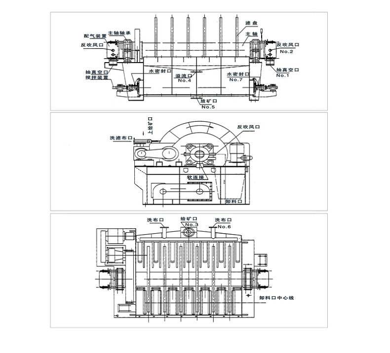 盤式真空過濾機由各個單獨的扇形片的圓盤構成。每一個扇形片為 單獨的過濾單元,由濾布做成布套在扇形片上形成濾室。過濾盤由電機通過減速器及開式齒輪傳動來驅動 ,過濾盤順時針方向轉動,濾室里的礦漿在吸附區借助于真空泵在過濾介質兩側形成的壓力差,附著在過 濾盤上形成濾餅后,攪拌器旋轉防止固體沉淀,濾餅離開液面后,在真空作用下繼續脫去水分。濾液透過 濾布,經過濾液管,從分配頭排出。濾餅在卸料區由反吹風卸料落入排料槽,整個作業過程連續循環進行 。
